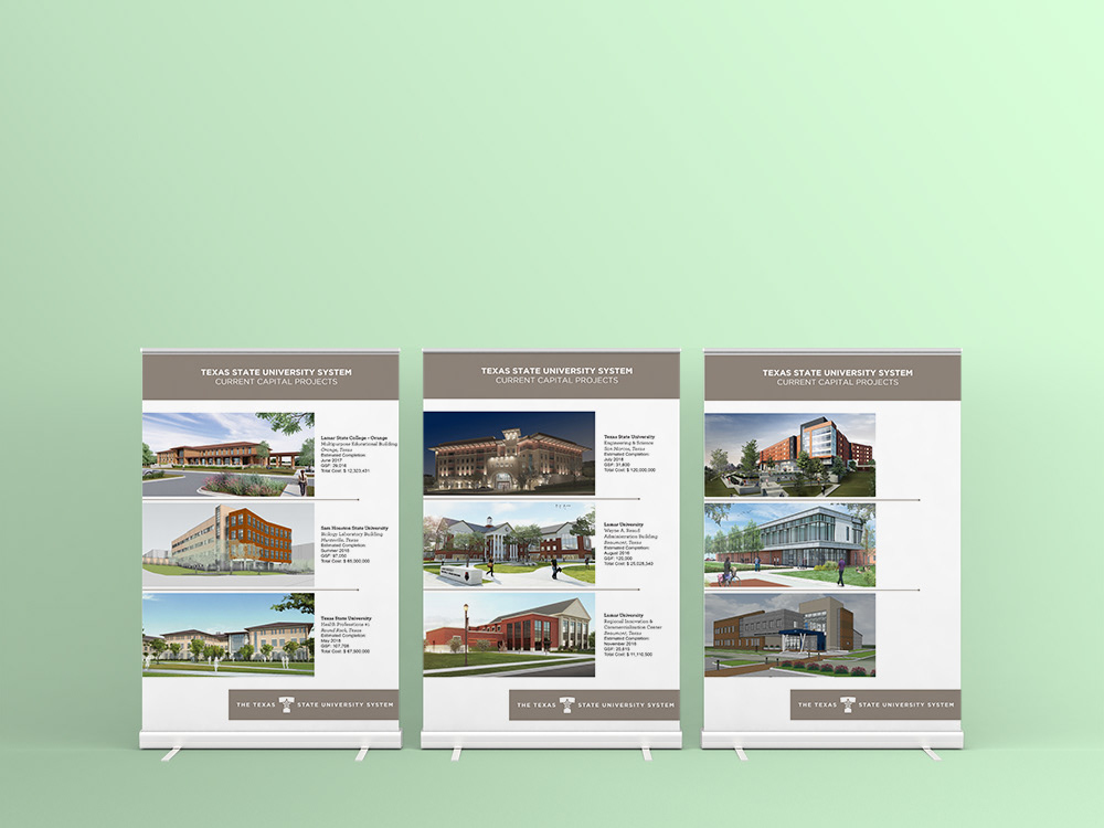 These banners were created for the Texas State University System to exhibit multiple projects that were in development at an Architectural Showcase.